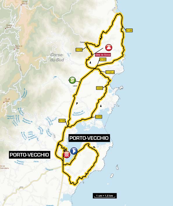 Stage 1 consists of 2 laps around the capital of Porto-Vecchio. The route offers only one classified climb, the Cote de Conca, 2.1 kilometres long with an average gradient of 5.7%. The ascent is about halfway through the loop and not likely to worry the sprinters.