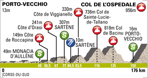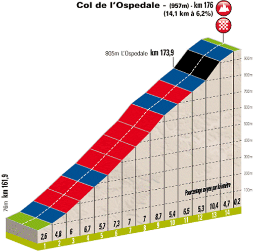 On the long descent to Porto-Vecchio riders with good legs will look to be at the front for the final climb, the Col de l'Ospedale. The climb opens abruptly upon crossing Porto-Vecchio. The ascent is 14.1 kilometres long with an average gradient of 6.2 %. The steepest section of 10.4% begins 2 kilometres from the top.