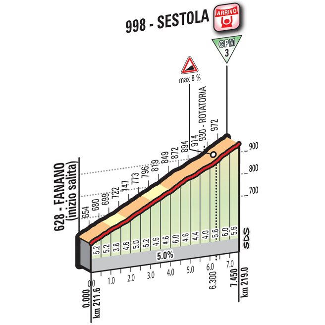 The end of the stage holds two climbs in store. Pian del Falco is 16 kilometres, with stretches at 13% in the upper part. The middle section is nothing to worry about as from kilometre 6 to kilometres 13.5 the climb is a false flat.
