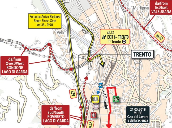The start ramp is located in Trento, town of Leonardo Bertagnolli and the Mosers. The route runs through the Trentino-Alto Adige/Südtirol region, home of the Tour of the Alps, which is often used as a preparation for the Giro.