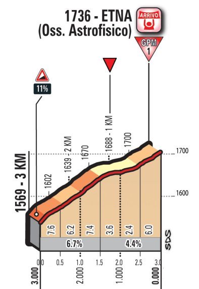 The 4th stage of the last edition of the Giro ran to the shelter Rifugio Sapienza, located at an elevation of 1,892 metres on the south flank of Mount Etna. The closing climb amounted to almost 18 kilometres, while the average gradient was 6.6%. The riders were plagued by constant headwinds and the race never really took off. Early attacker Jan Polanc took the win.
