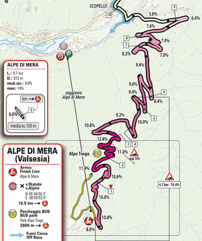 After the descent the route follows the Sesia upstream to Scopello. Which is where the unprecedented finish climb kicks in. The Alpe di Mera is 9.7 kilometres long and the average gradient sits at 9%. It's a hard test with the steepest part in the second half. The last 3 kilometres rise at an unforgiving 10.5% to the line.