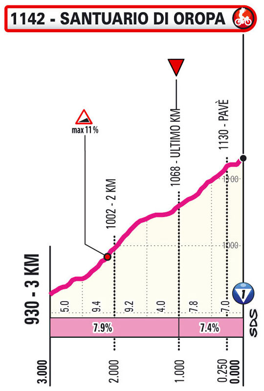 The climb to Oropa was last included in 2017. At an elevation of 1,142 metres, the sanctuary is reached after a 11.8 kilometres climb at 6.2% with steepest sectors of up to 13%. It is an irregular ascent with the most unwelcoming sectors from kilometre 5 onwards.