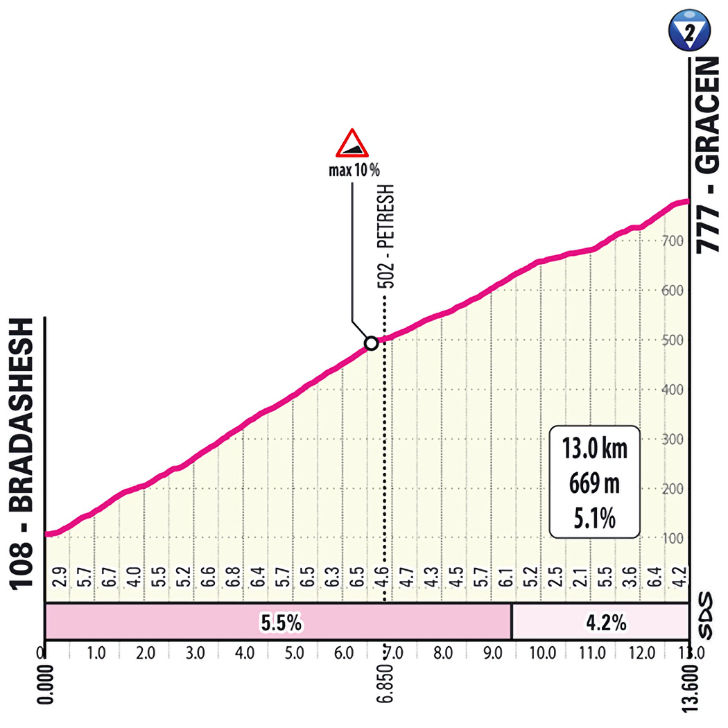 The Giro sets off from the port city of Durazzo – or, as the Albanians call it, Durrës – and opens with a pancake-flat section of 70 kilometres. The riders then face the climb to Gracen, which spans 13 kilometres and averages 5.1%.