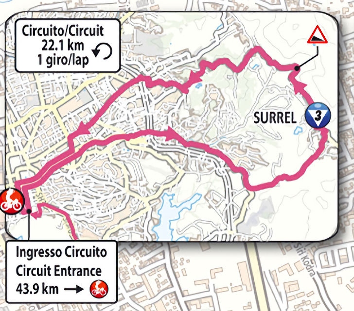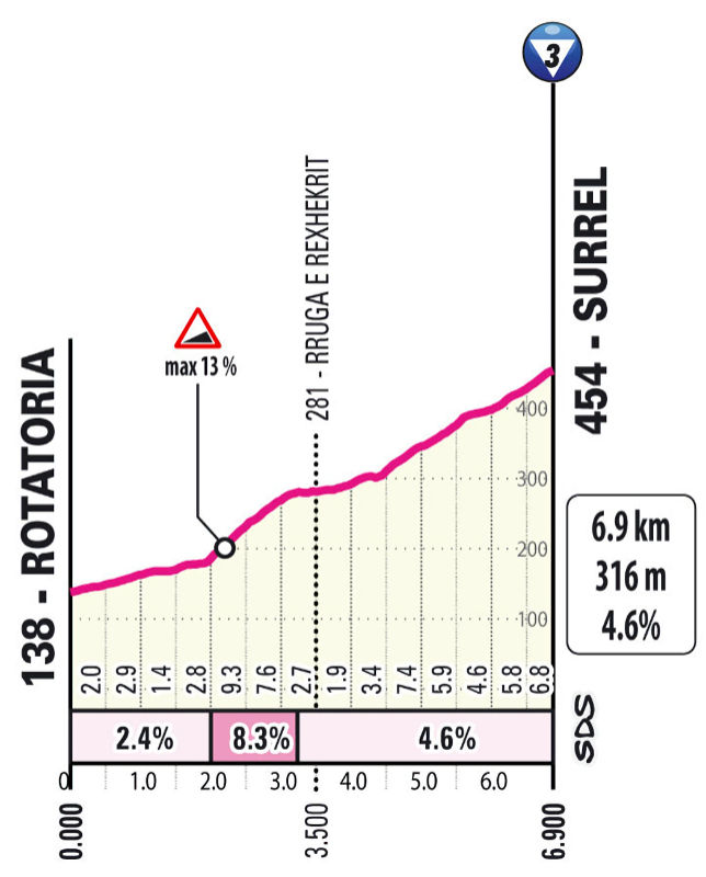 Each lap includes the Surrel, a 6.9-kilometre hill with an average gradient of 4.6%. However, that average is misleading, as the first part is a false flat before the third kilometre averages 8.3%.