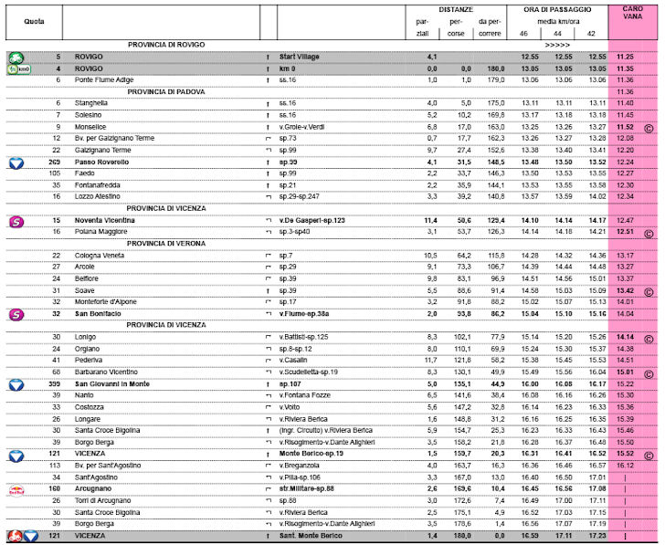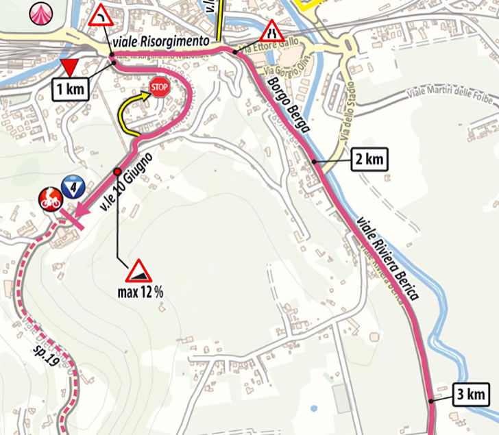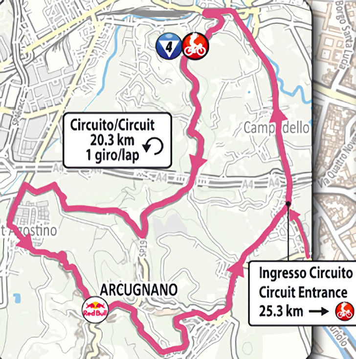 The intermediate sprint in Arcugnano comes 169.6 kilometres into the race, with 6, 4 and 2 bonus seconds up for grabs; at the finish line, 10, 6 and 4 seconds await the first three riders.