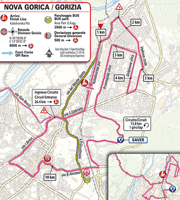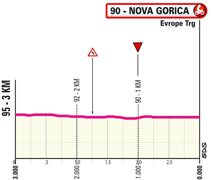 Shortly after crossing into Slovenia, the riders tackle the Goniace San Martino, a 3.6-kilometre climb at 5.1%. After the descent, the peloton arrives at a local circuit between Nova Gorica (Slovenia) and Gorizia (Italy), which they’ll complete twice. Each lap features the Saver climb, a 600-metre test at 6.4%. Once they crest the Saver for the second time, only 7.5 kilometres remain to the finish.
