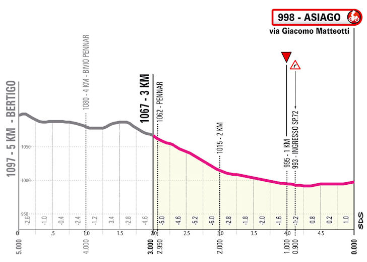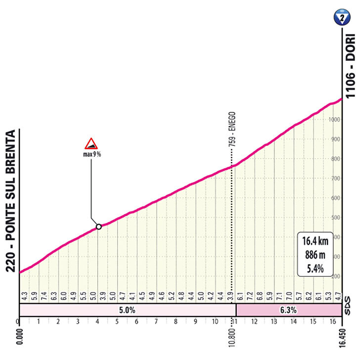 Once over the top at Dori, there’s still 18.5 kilometres to go. The route begins with a short descent, followed by a sharp 1.5-kilometre climb at 8.3%, before rolling terrain leads the way to the finish in Asiago.