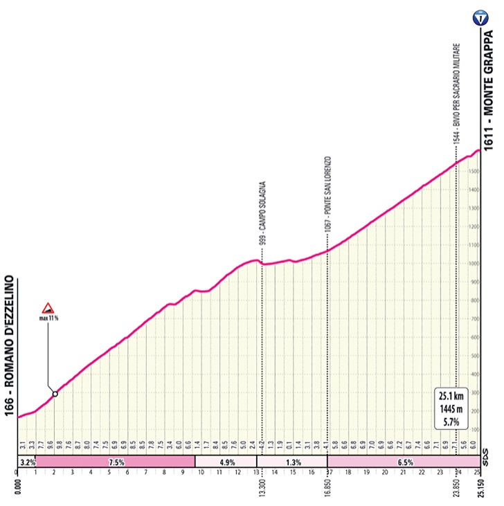 The day’s true monster comes around 80 mostly kilometres later: the Monte Grappa. A staggering 25.1 kilometres long with an average gradient of 5.7% and ramps up to 11%, this climb could reshape the GC standings.