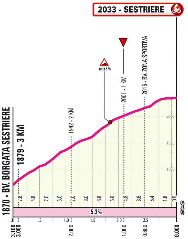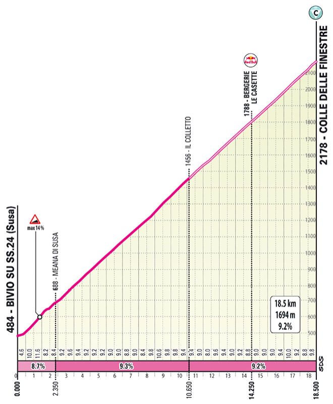 Saturday, 31 May – The final mountain stage of this year’s Giro spans 205 kilometres. Featuring climbs up the Colle del Lys and the partly unpaved Colle delle Finestre, the races reaches its climax on the 8-kilometre ascent at 5.9% to Sestrière.