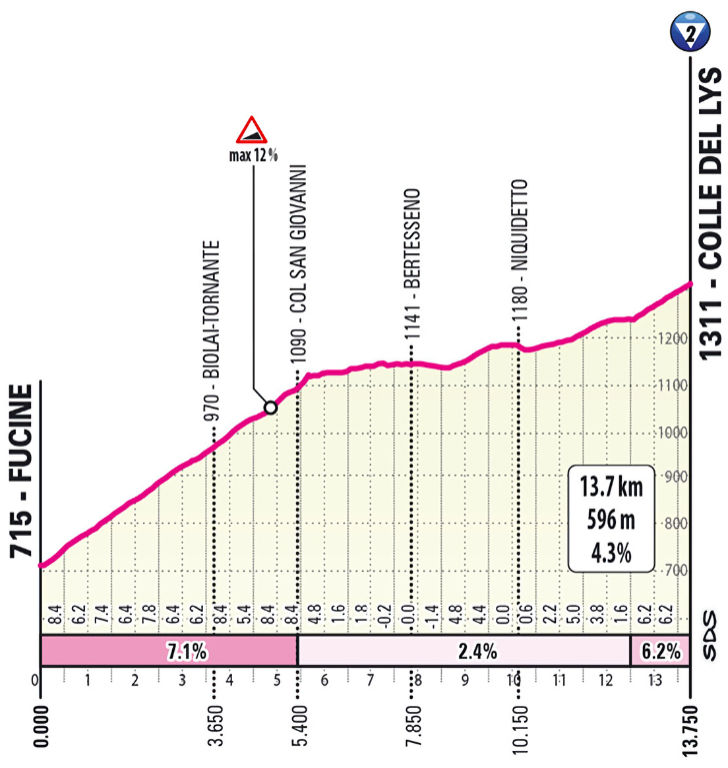 The first 100 kilometres are hardly worth mentioning. The riders travel on predominantly flat roads towards the Colle del Lys, a 13.7-kilometre climb with an average gradient of 4.7%.