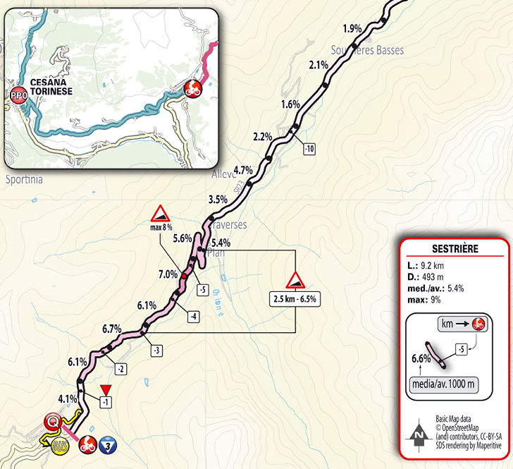 The descent off the Finestre is narrow and technical, and at Pragelato, the final climb to the ski village of Sestrière begins. It’s another long slog, but not as intimidating as the Finestre. The first part is a false flat, before the final 9.2 kilometres deliver a 5.4% gradient.
