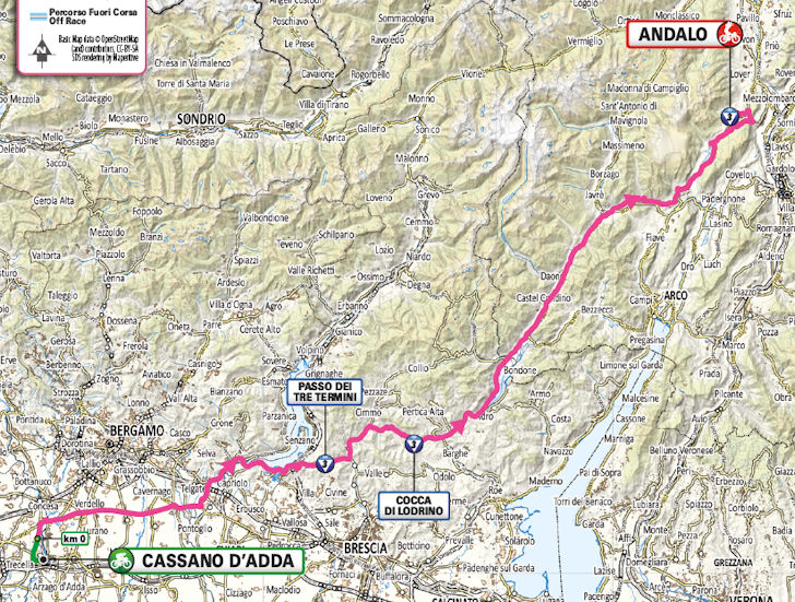 After the start in Cassano d’Adda - birthplace of the 1966 Giro winner Gianni Motta - the riders head across the flat terrain to Lake Iseo. They follow the southern shore before tackling the Passo dei Tre Termini, an 8.2-kilometre climb at 5.9%. After descending to the Mella Valley, they follow the river for a few kilometres upstream before facing the Cocca de Lodrino — 8.1 kilometres at 4.1%.