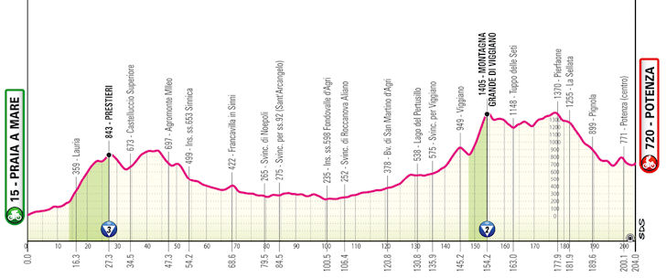 Following a brief drop, the riders tackle the Montagna Grande di Viggiano, a 6.6-kilometre climb averaging 9.2%. There is no significant descent afterwards, instead, the riders remain at altitude for roughly 20 kilometres, tackling several short climbs along the way. From the Monte Pierfaone, the road then descends towards a promising finale in Potenza.