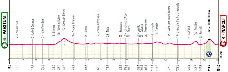 A sting in the tail appears in the Fuorigrotta district, with a 2-kilometre climb at a 6.2% gradient. Once over the top, 7.3 kilometres remain to the finish.