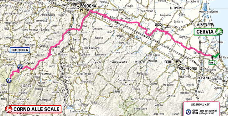 Sunday, 17 May – At 184 kilometres, the 9th stage of the Giro d’Italia travels from Cervia to Corno alle Scale. The route is almost entirely flat until the final 28 kilometres rise at 4.4% to the line. The last 3 kilometres climb at almost 10%.
