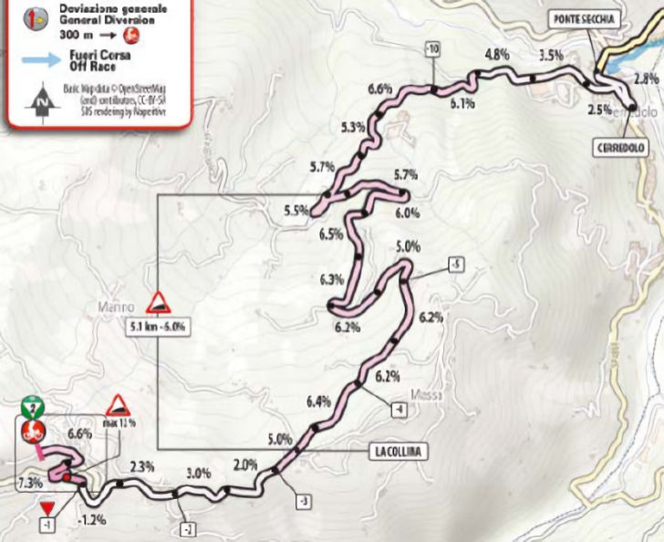 The road ascends with an average gradient of 4.9% in the final 12.5 kilometres, with the first 9.3 kilometers rising at 5.5%. The road then levels off before ramping up to 6.8% after the flamme rouge. The steepest section, at 12%, appears 600 metres before the finish line.