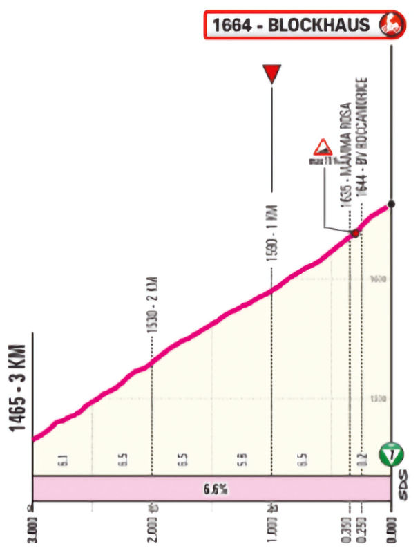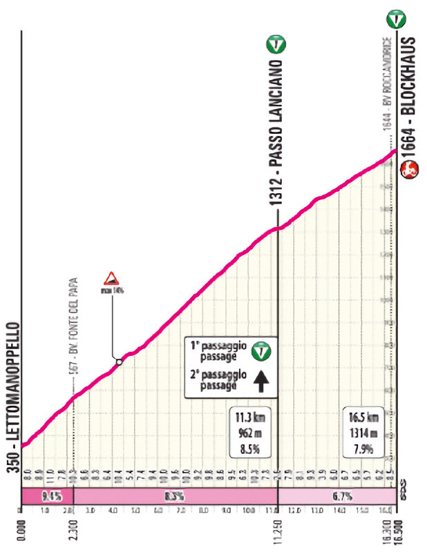 First, the riders tackle the Passo Lanciano, which is actually just another name for the Blockhaus. Intially, they don’t go all the way to the top. The climbing stops at 1,312 metres above sea level. Which is still a 11.3 kilometres toil at 8.5%.