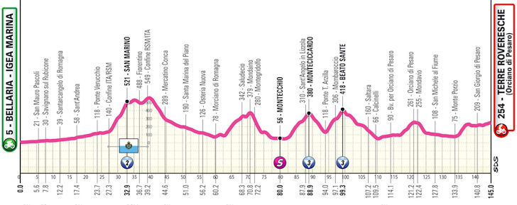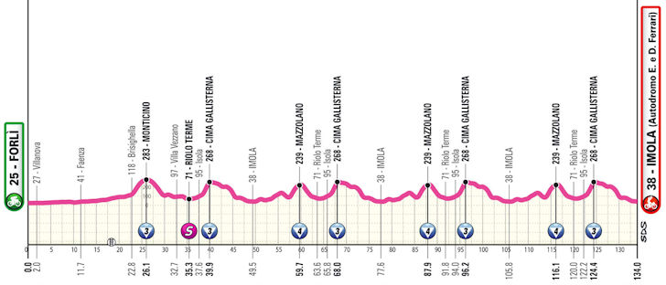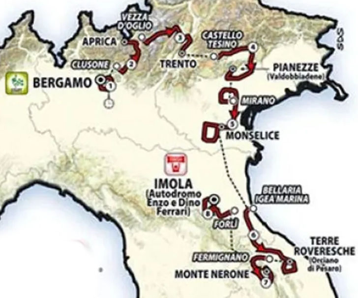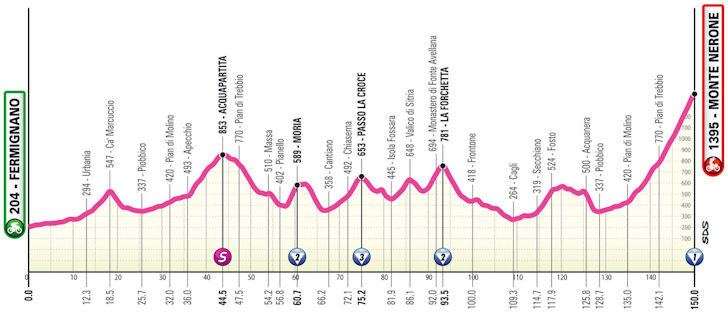 The queen stage is on day seven, covering 150 kilometres and 3,850 metres of elevation. The finale is played out on the Monte Nerone, a 14.6-kilometre climb at 6.7%, with the last 2.5 kilometres rising at a punishing 9%.