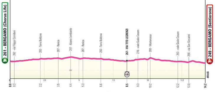 The Giro d’Italia Women opens with a 14.2-kilometre ITT starting and finishing in Bergamo. The course is flat, except for a 500-metre climb at 5%.