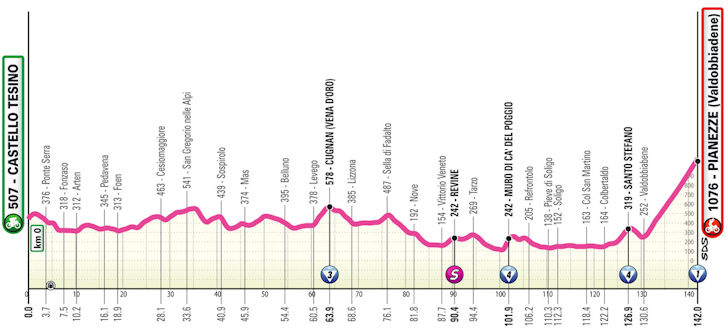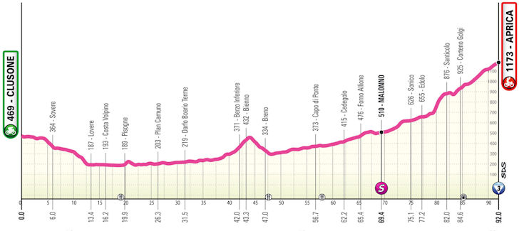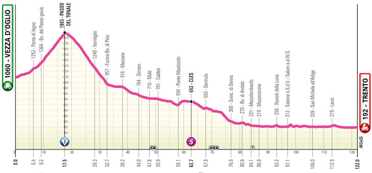 Stage 3 begins with the Passo del Tonale — 8.4 kilometres at 6.1% — followed by a long descent leading onto the final 40 kilometres on flat terrain.