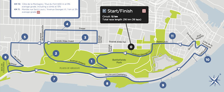 For the first time in years, the Grand Prix Cycliste de Québec deviates from its usual route. The start is on Avenue George VI in the Parc des Champs-de-Bataille, with the riders first covering just over 2 kilometres through the city park. That section has always been part of the course, but whereas they used to turn left after leaving the park, this time they swing right onto Grande Allée Ouest. After a loop of roughly 2 kilometres, they rejoin the familiar circuit.