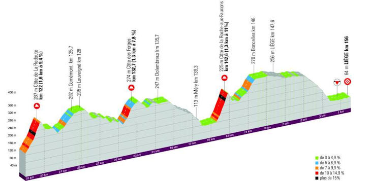 After the summit the road continues in rolling fashion until the riders dive towards the Côte de la Roche-aux-Faucons, a 1.3-kilometre wall averaging 11%. After the summit comes a short descent, followed by two stings in the tail: 1 kilometre at 3.6% and then 1 kilometre at 6.2%. A gently rolling section then leads into the downhill plunge to Liège, which begins just over 5 kilometres from the finish. Once in the city, the final 2 kilometres are flat.