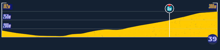 At 97 kilometres, the riders face the finishing climb for the first time. It's a 1.9 kilometres test at 5.6% - a bit tougher than the numbers suggest, as there’s a false flat run-up to it.