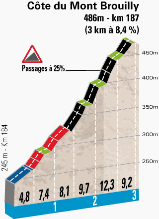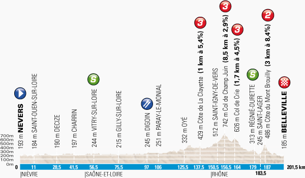 There are a lot of hills scattered between Nevers and Belleville which should encourage breakaway specialists - this could be the day they make it to the end, especially with the prospect of the Côte du Mont Brouilly with just 14.5 kilometres to go. The first kilometre of Mont Brouilly is relatively easy with a 4.8% incline, but it then moves on to a section with a max gradient of 25%. The total ascent is a bit longer than 3 kilometres with an overall gradient of 8.4%. If a breakaway make it over in one piece, it's a straightforward run in to the finish line.