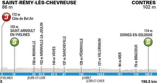 Departure-place Saint-Rémy-lès-Chevreuse is nestled in the green woods to the southwest of Paris. The riders head south and without much of a detour they arrive in Contres. The River Loire is crossed with 40 kilometres left.