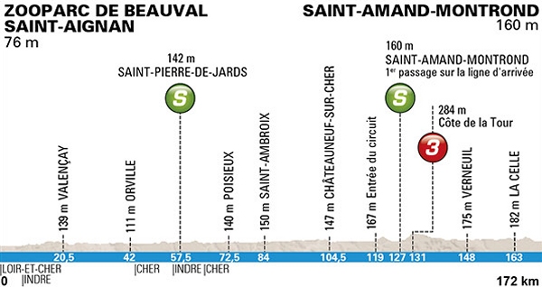 In the 2013 Tour de France Saint-Amand-Montrond was the arrival-town of a spectacular stage. The route was not spectacular in itself, cross-wind made it so be ripping the pack up into pieces and bits. Valverde had to pay big-time while Froome suffered some (minor) damage also. Cavendish took the stage after a brilliant performance by his team Omega Pharma (now Etixx). Will the race be as hard as then? We need to wait and see, but the scenery looks alarming quiet. The Loire, the longest river in France, meanders leisurely through the region aptly named Centre. On its banks are numerous beautiful ancient towns, chateaux and vineyards. Is this the face of deception...? In theory today’s route is as unchallenging as the Tour de France stage to Saint Amand Montrond. A long flat build-up to a local round of 45 kilometres with 4 kilometres after the first crossing of the finish line a small climb - Côte de La Tour, 3rd category 4 kilometres at 3%. In theory today’s route is tailor-made for a bunch sprint at blistering speeds with a 2 kilometres downhill section at 3.5% with 5 kilometres left. But what are theories worth in central France? Ask Alejandro Valverde, he will know the answer… Stage 2 starts 11.30 AM local time, while the arrival is expected approximately 03:50 PM.