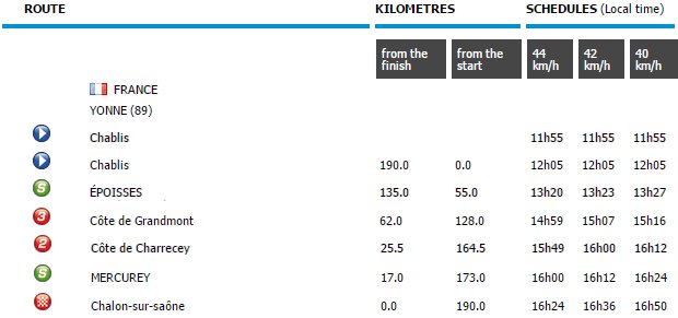 The first three riders on the line in Chalon-sur-Saône take time bonuses of 10, 6 and 4 seconds. Two intermediate sprints (after 55 and 173 kilometres) come with 3, 2 and 1 second each.