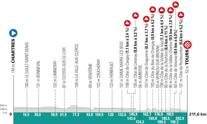 The Côte de la Vallée Chartier (500 metres at 7.9%) flows into the Peu Morier gravel sector, before the Côte de Vouvray (400 metres at 6.5%) leads directly to the gravel stretch near Rochecorbon. Roughly 3 kilometres later, the final climb of the day – Côte de Rochecorbon – thows in 600 metres at 5.2%, with the summit coming 8.7 kilometres from the finish line.