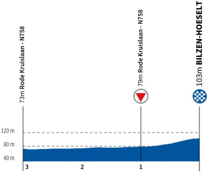 At 41.5 kilometres, the final lap only features the Slingerberg and the Gousbeemdstraat. The latter comes 8.1 kilometres before the finish in Bilzen-Hoeselt, where the last 500 metres rise to the line at moderate gradients.