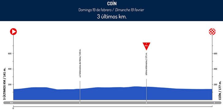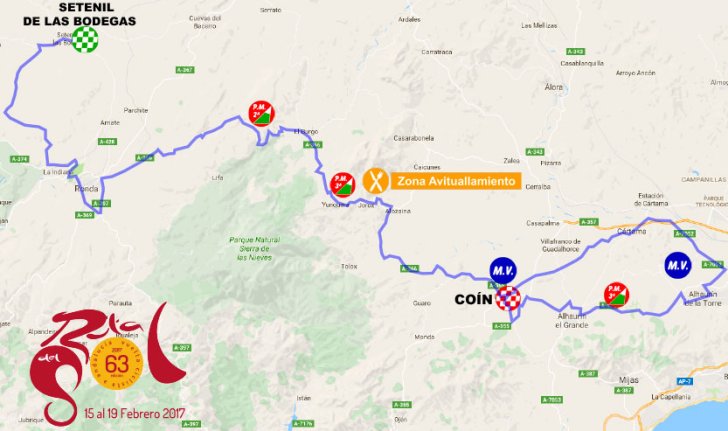 Stage 5 in 2017's Ruta del Sol takes in the climbs up the Puerto del Viento (3rd category) and the Puerto de las Abejas (3rd category) before descending to the arrival town. After a first passage through Coín a hilly circuit of 57 kilometres is set to close the five-day stage race. The Alto de Jarapalos (3rd category and 5.1 kilometres at 2.5%) is the biggest hurdle. The hill is crested with 16.5 kilometres left to race.