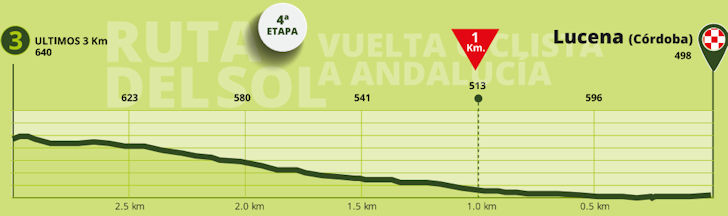 Lucena lies halfway between Córdoba and Granada in the heart of Andalucía, surrounded by rolling hills dotted with olive groves. The original 4th stage was supposed to start in Córdoba to conclude with four laps around Lucena. The four laps are all that remain - although ridden in the opposite direction -, and it's complemented with an extra climb to the line.