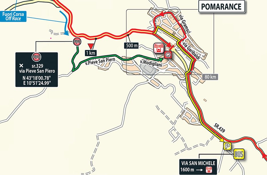 In Pomarance the riders plunge down to the foot of the next climb, which leads to the walled mountain top village Volterra. Following the descent a flat section of 20 kilometres runs to the next climb. This one goes to Montecatini Val di Cecina. The passage is at kilometre 205.7, so that's a little more than 20 kilometres left to race.