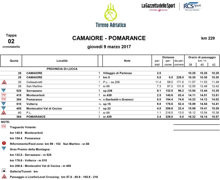 Tirreno-Adriatico 2017 Route stage 2: Camaiore – Pomarance