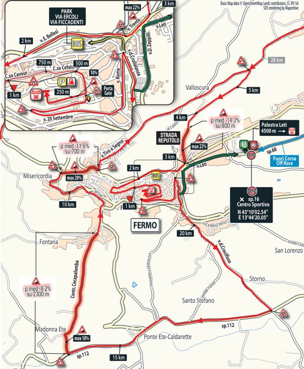 With 28.5 kilometres to go the riders enter the local circuit around Fermo, which is spiced up with three climbs. The first one leads up into the ancient town of Fermo. The first kilometre averages 14.3%, while the maximum slope accounts for 22%. The road continues on a false flat for 2 kilometres before the last 650 metres rise at 6.5%.