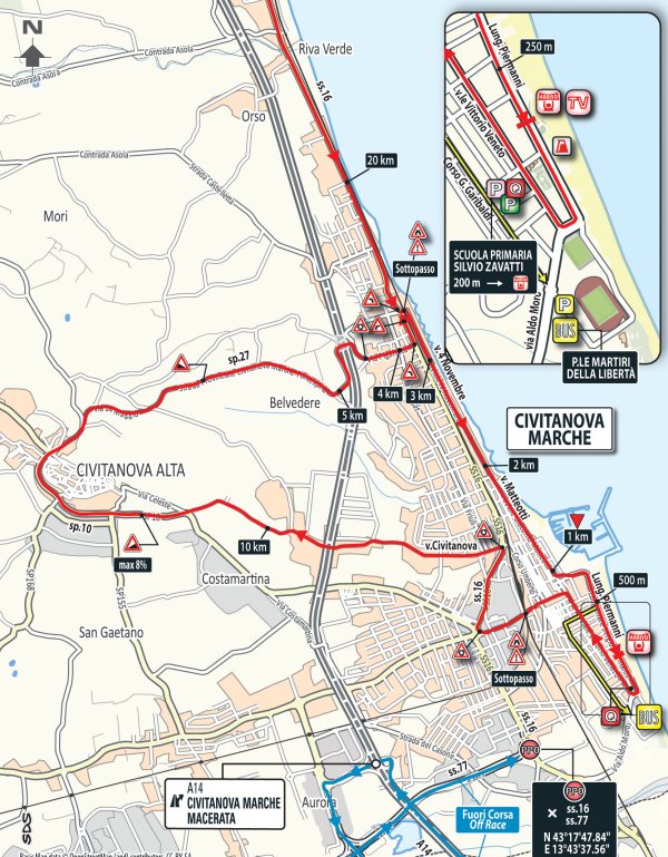 At kilometre 139 the riders enter a final circuit. They tackle a two-stage climb to Civitanova Alta before the first passage on the line with 15.7 kilometres to go. That same climb is crested again with 8 kilometres left, which makes it a perfect spot to go on the attack. The first 1.6 kilometre goes up at 4.7% and following a 500 metres intermezzo the last kilometre accounts for a 7.4% gradient. A fast drop takes the riders to a flat run to the line of 3.5 kilometres.