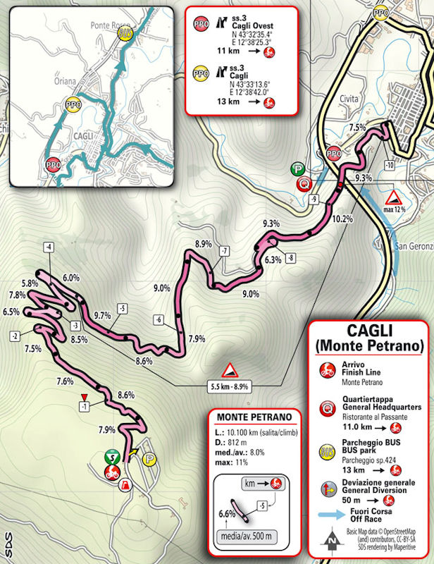 Monte Petrano is a 10.1 kilometres long ascent with an average gradient of 8.1%. The first 1.5 kilometres are double digit material; the first half of the climb is the toughest part anyway. The gradient drops to 6% in the last 2 kilometres before the home straight is actually more of a false flat.