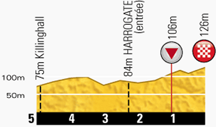 The first serious hurdle of the day is the 424 meter high Kidstones, crested after 85 kilometres. The climb is only 2.9 kilometres in length and has an average gradient of 6.3%. The steepest part of 16% is just under the top. Upon cresting it is 30 kilometres to the top of the next hill.