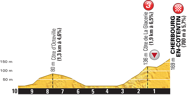 In all likelihood, today’s cannon fire will be hidden in the legs of the puncheurs. The stage closes in Cherbourg-Octeville after a 3,1 kilometres closing climb up to Cherbourg Octeville. The first part is the Côte de la Glacerie – 1.9 kilometres at 6.5% with a steepest section at 14% -, than a slight descent before the last 700 metres go up at 5.7%.