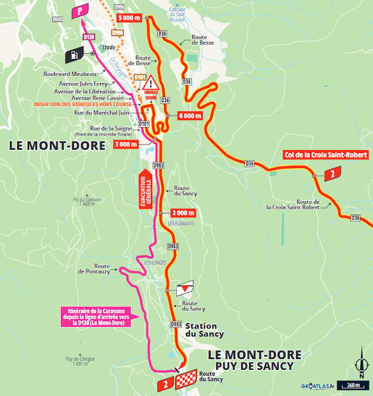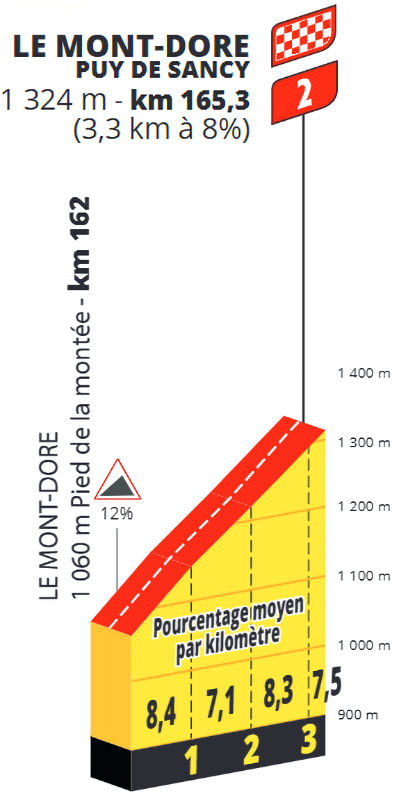 The deciding phase begins with a downhill to Lac Chambon, followed by an unclassified 2.3-kilometre ramp at 7.8% and a rolling section of 10 kilometres. Then all masks will come off as the riders race for victory or time gains. The Col de la Croix Saint-Robert (5.1 kilometres at 6.4%) precedes the final push to the summit of Puy de Sancy (3.3 kilometres at 8%) in the mountains above Le Mont-Dore.
