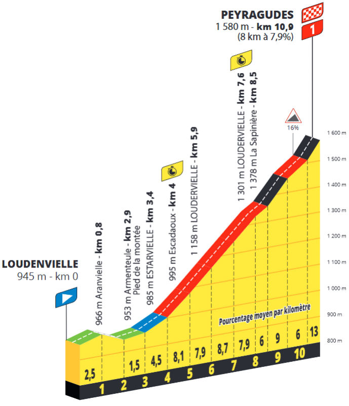 Friday, 18 July – An individual time trial of 10.9 kilometres takes the riders from the valley floor up to the runway of Altiport 007 in Peyragudes. After a flat start, the soloists face 8 kilometres of uphill torture at 7.8%, while the last kilometre ramps up at an unforgiving 13%.