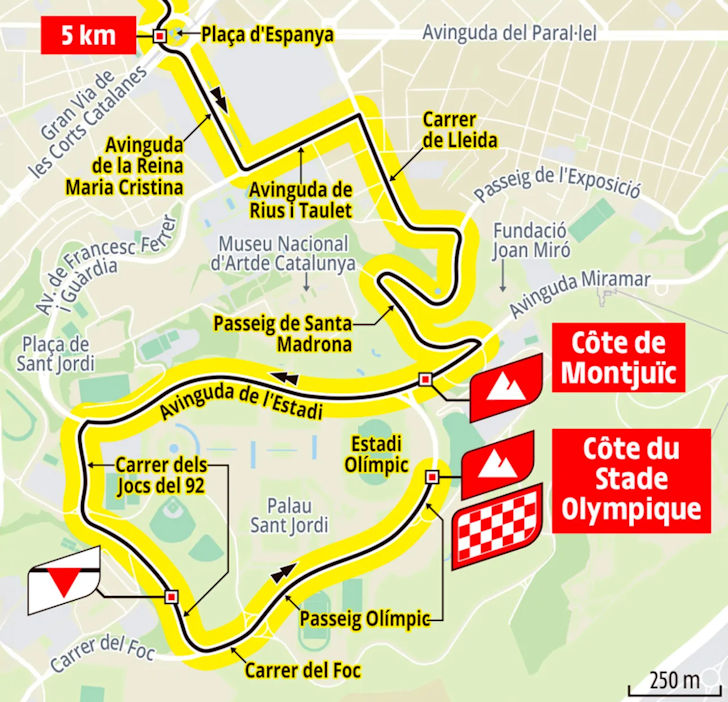 Just after halfway, the riders pass the Sagrada Família, and just after Parc Joan Miró the character of the route changes. From there it becomes more twisting and the road begins to rise. Over the Plaça d’Espanya the riders charge towards Montjuïc, starting with a 1.1-kilometre climb at 5.1%. A false-flat descent of 1 kilometre and another kilometre on the flat then precedes a final 800-metre rise to the line. This finishing stretch climbs at an average gradient of 7%.