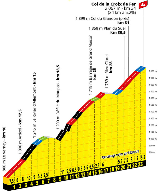 Bourg d’Oisans sits at the foot of the climb to Alpe d’Huez, but also at the foot of the Col de la Croix de Fer. Shortly after the start, the riders head up the latter. It's a tough opener of 24 kilometres at an average gradient of 5.2%. Steeper ramps alternate with short downhill stretches, making it hard to find a rhythm.