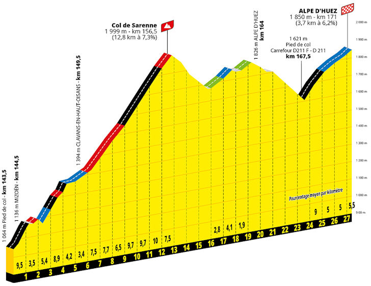 It's 14.5 kilometres from the Sarenne's summit to Alpe d’Huez. The first part goes downhill, before a rolling uphill section precedes another short drop. The final 3.7 kilometres then climb at an average of 6.2%, with the opening ramps the toughest.