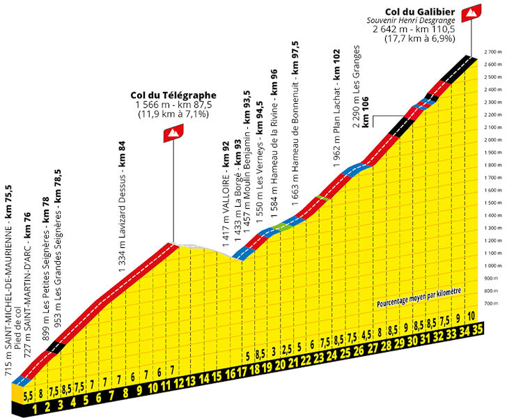 After 34 kilometres, the peloton crests the summit and plunges down towards Saint-Jean-de-Maurienne. Roughly 15 kilometres later, the Col du Télégraphe marks the start of almost 30 kilometres of uphill torture. It's a 11.9 kilometres test at 7.1%, which runs virtually straight onto the Col du Galibier, with barely a descent in between. The Galibier adds another 17.7 kilometres of climbing at 6.9%. The summit tops out at 2,642 metres above sea level, making it the highest point of this Tour.