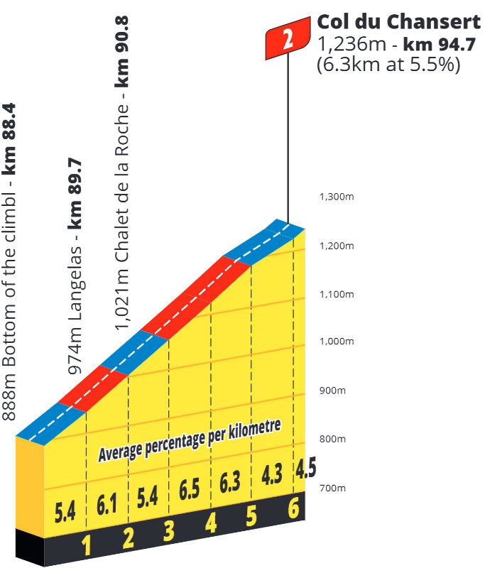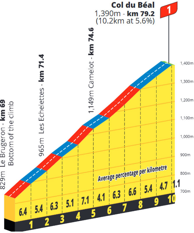 After descending the Côte d’Augerolles and a stint on the flat, the riders face about 10 kilometres at shallow gradients leading up to the base of the Col du Béal. The Béal is a 10.2-kilometre climb with an average gradient of 5.6%. A short descent then takes the riders onto the 6.3-kilometre at 5.5% of the Col du Chansert.